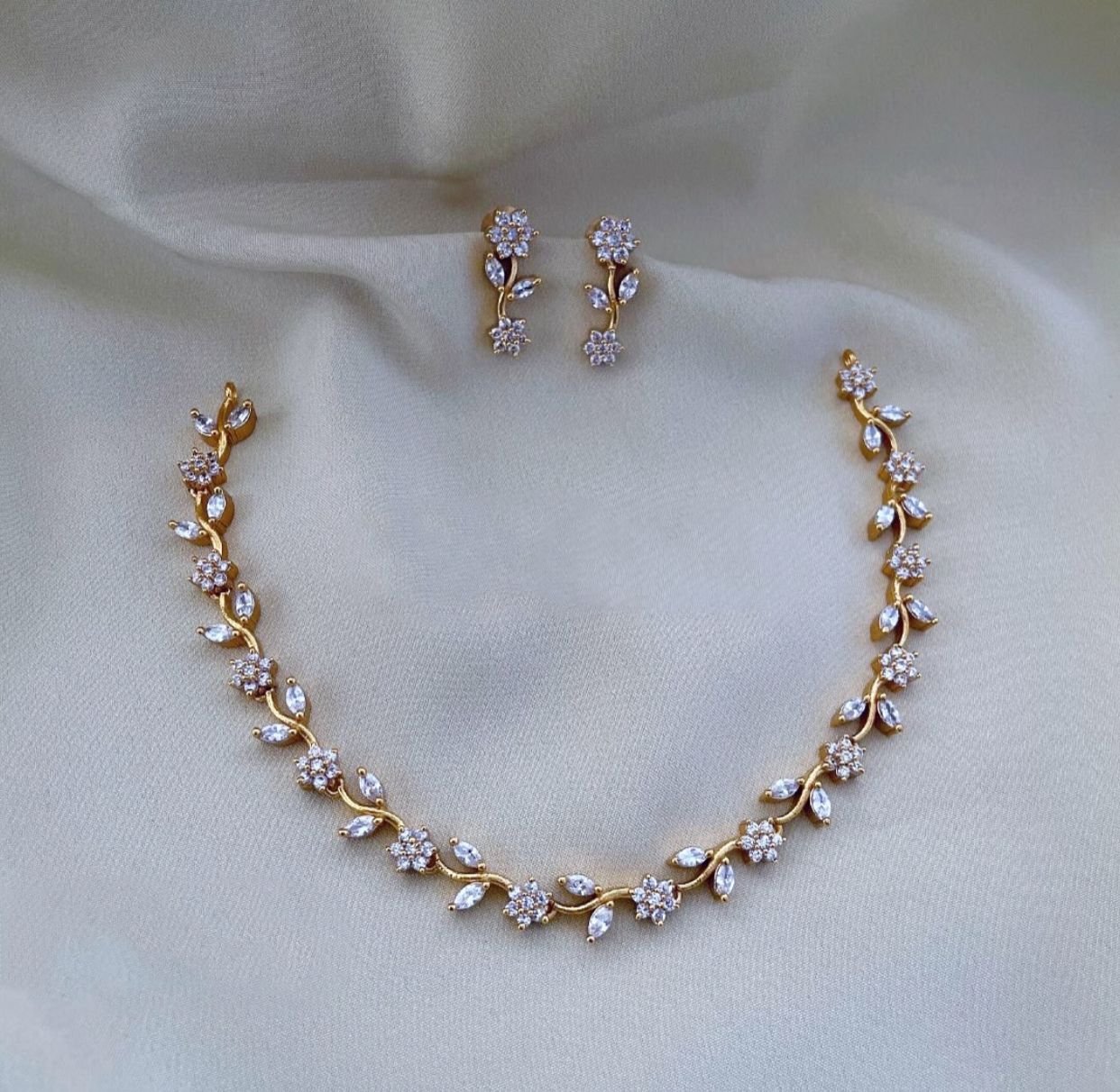 Dainty floral white stone cubic zirconia short necklace with earrings