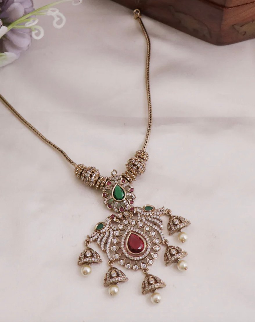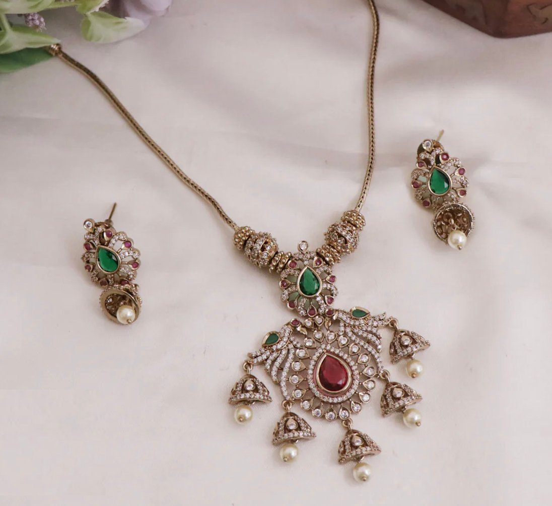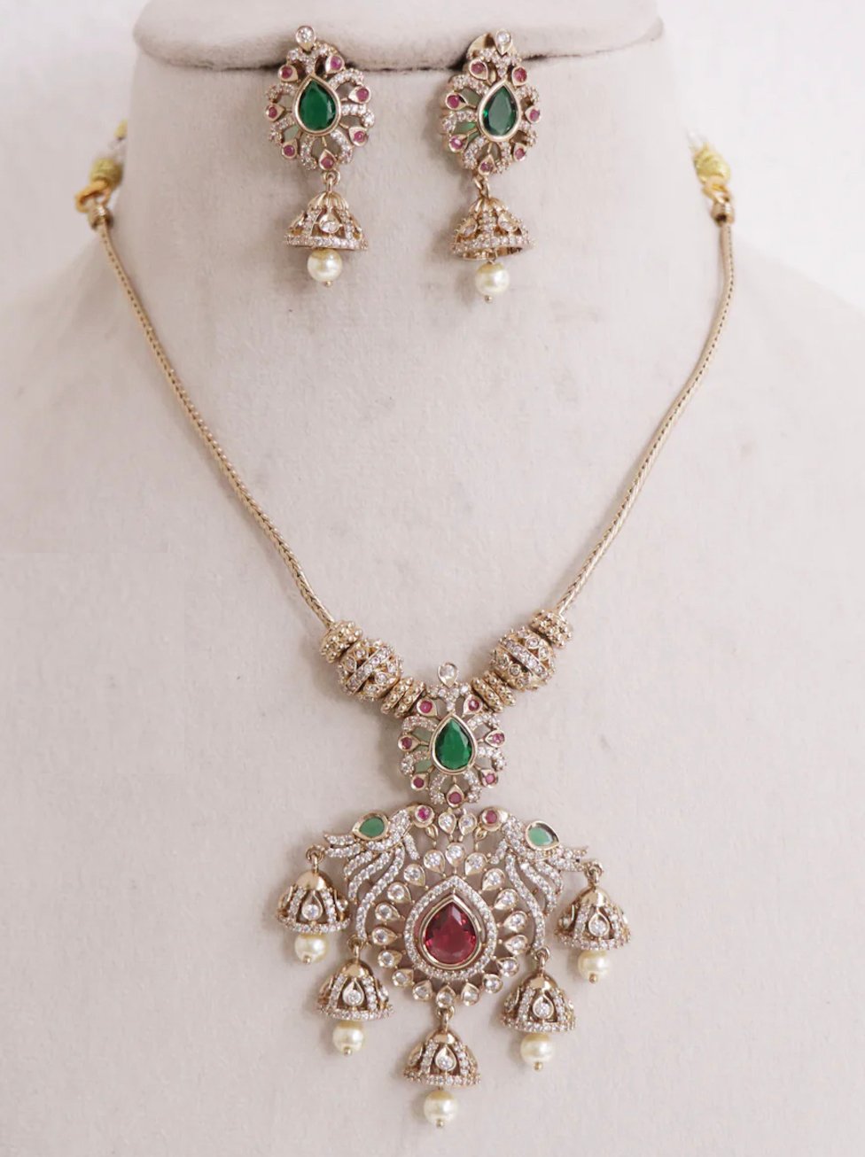 Short Victorian Cubic Zirconia Peacock Necklace with Mini Jhumkas
