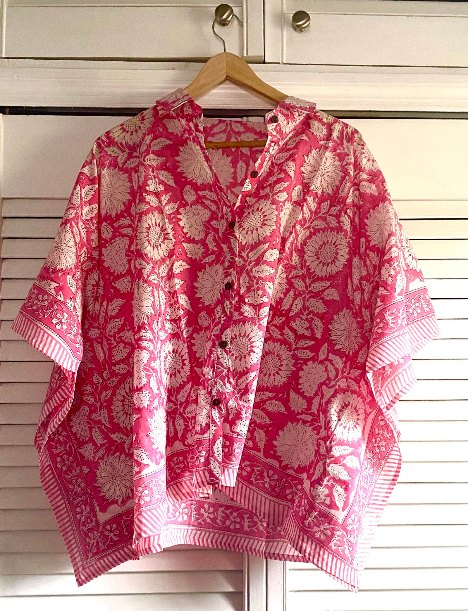Soft Mul-Cotton Kaftan Shirt-Floral Block Print from Rajasthan- Hot pink and cream