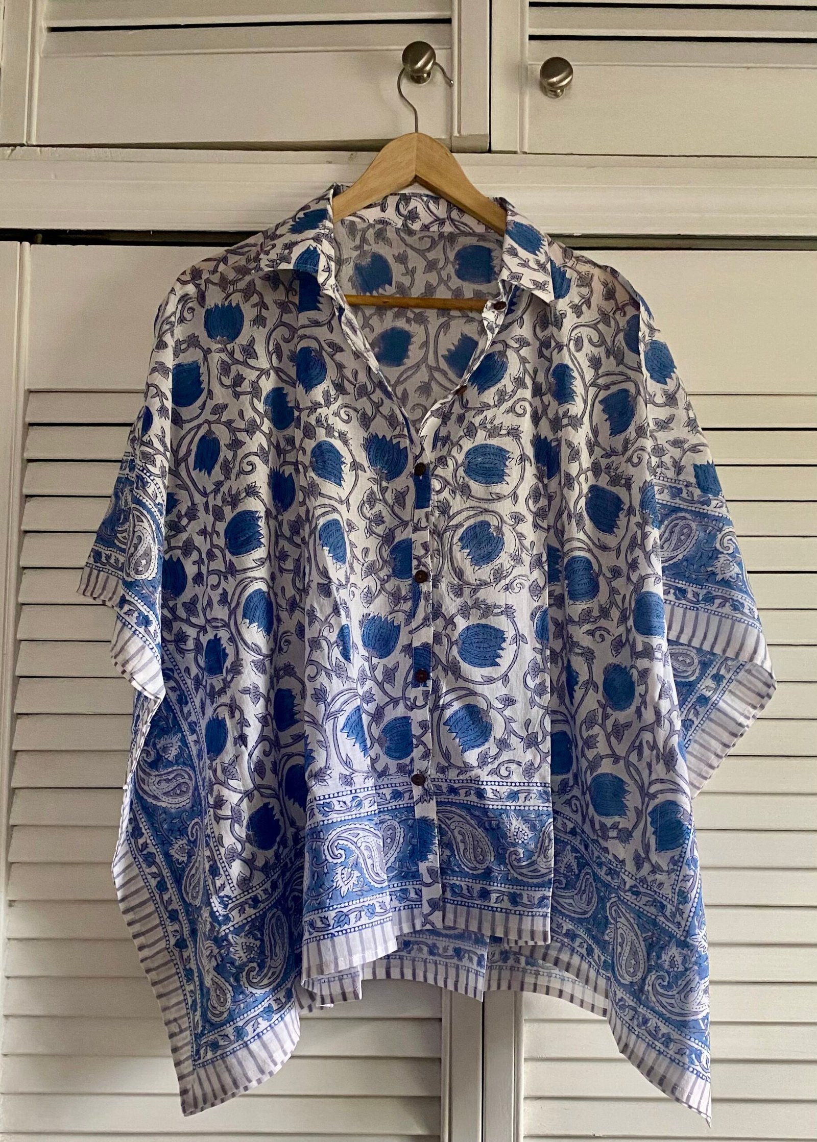 + Free ShippingThe kaftan shirt from D’Indian Trends is loose, free-flowing and made to move with you. Made from a soft breathable fabric called mul cotton that gets softer with each wash and is hand block-printed by artisans in Rajasthan. This style comes in one size, be inclusive and is thoughtfully designed to fit XS to 3XL. It’s the kind of piece you reach for without thinking; brunch mornings, slow beach days, or evenings that unfold gently. Effortless. Breathable. Uncomplicated. This shirt is meant to be worn oversized.