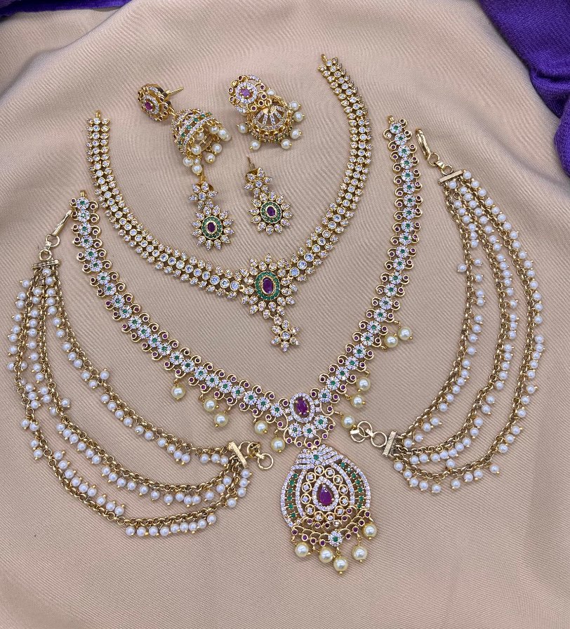 South Indian Temple-Cubic Zirconia Necklace Sets with Earrings and Earring Hair Chains